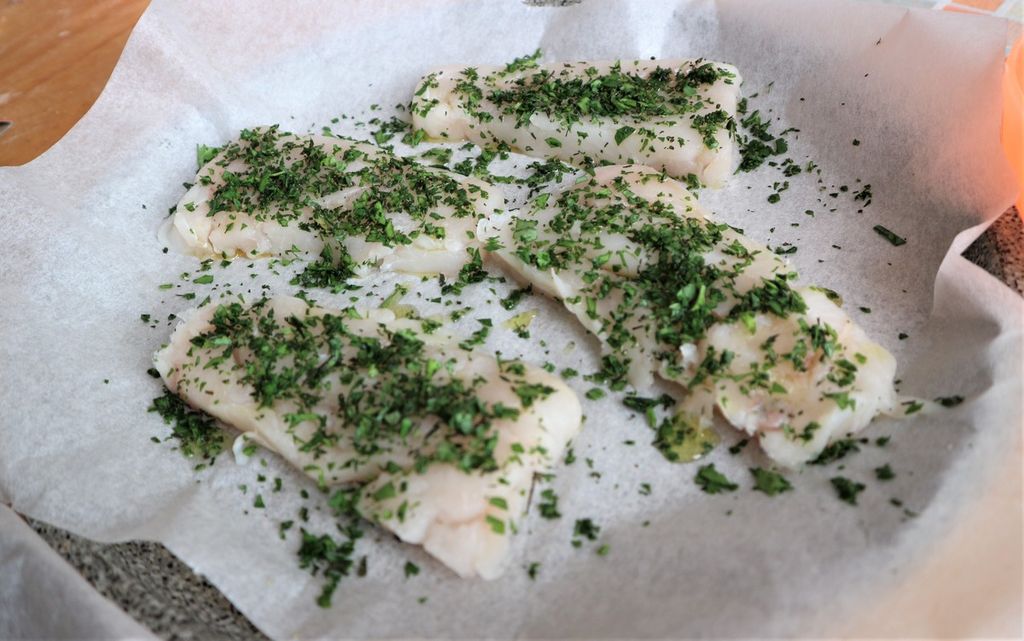 Ricoprite una teglia da forno con carta forno, adagiatevi i filetti di merluzzo, irrorateli con un filo d’olio extra vergine, una macinata di sale e un trito di erbe aromatiche, quindi mettetelo in forno a 200°C per 12-13 minuti.