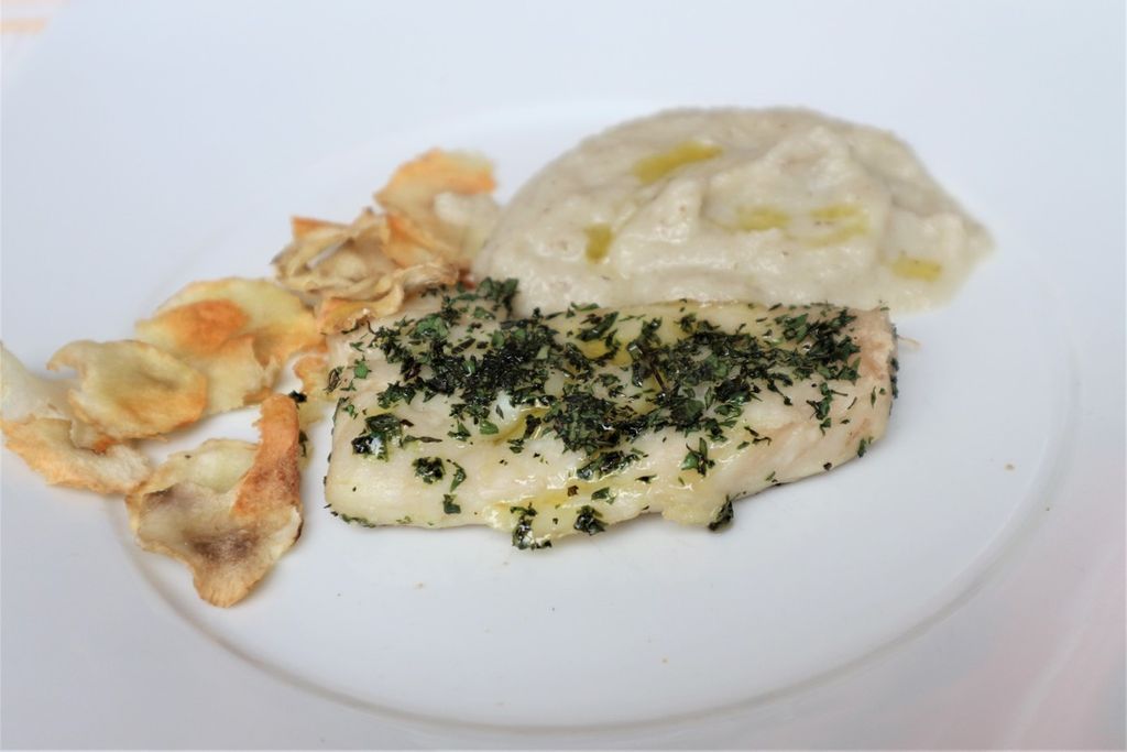 Servite il merluzzo su un fondo di crema di topinambur ed un filo di olio extra vergine di oliva.