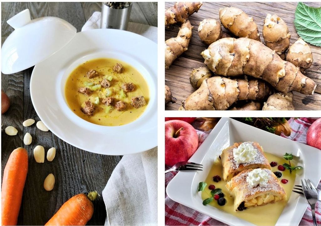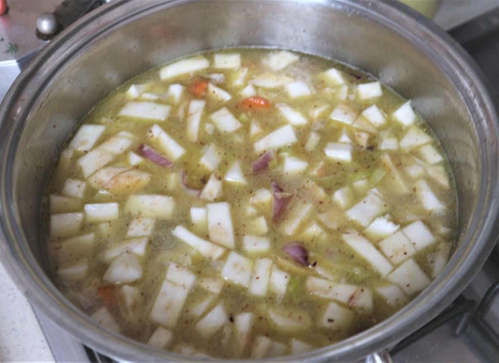 Preparate la crema di topinambur. Sbucciate il topinambur e tagliatelo a cubetti; tritate lo scalogno e fatelo rosolare in un tegame con un filo d’olio, quindi aggiungete il topinambur e fatelo dorare. Aggiustate di sale e pepe, quindi copritelo con il brodo vegetale e fate cuocere per circa 20 minuti o comunque fino a quando il topinambur risulterà morbido.