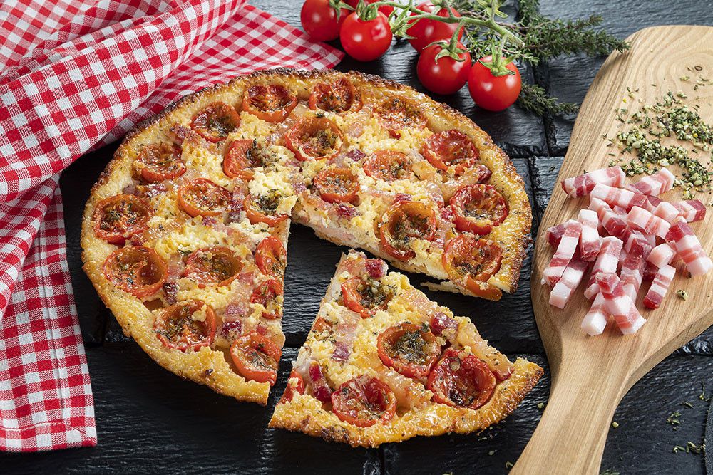 Pizza sfogliata con pomorini confit, robiola e fiammiferi di pancetta affumicata