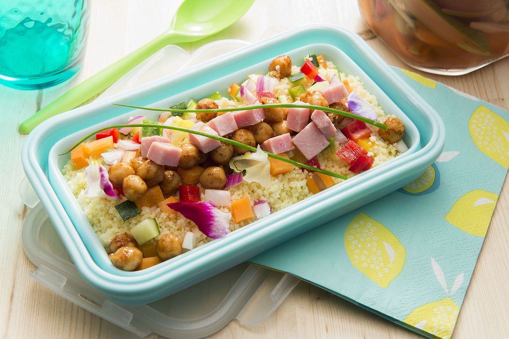 Cous cous con ceci alla paprica, cubetti di cotto e primavera di verdure