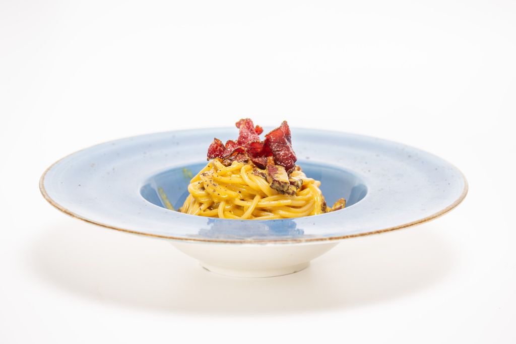 Piccolo bistrot situato in zona Porta Romana, Dabass si caratterizza per un’atmosfera minimal e contemporanea che si riflette nella sua cucina attraverso la presentazione dei piatti. La carbonara, qui, viene rivisitata dallo chef Andrea Marroni con uno stile moderno e ricercato con le uova che vengono cotte sottovuoto per circa un’ora insieme al pecorino, ai pistilli di zafferano e alla scorza del limone; si aggiungono poi gli albumi tenuti in caldo. A parte si lavorano i cubetti di guanciale facendoli trasudare in una padella antiaderente fino a che non risulteranno belli croccanti e asciutti. Per ultimo si manteca la pasta al dente insieme al condimento aggiungendo il pecorino e il pepe precedentemente tostato in padella. L’impiattamento vuole i rigatoni disposti in verticale con sopra la spuma di carbonara e i cubetti restanti di guanciale.