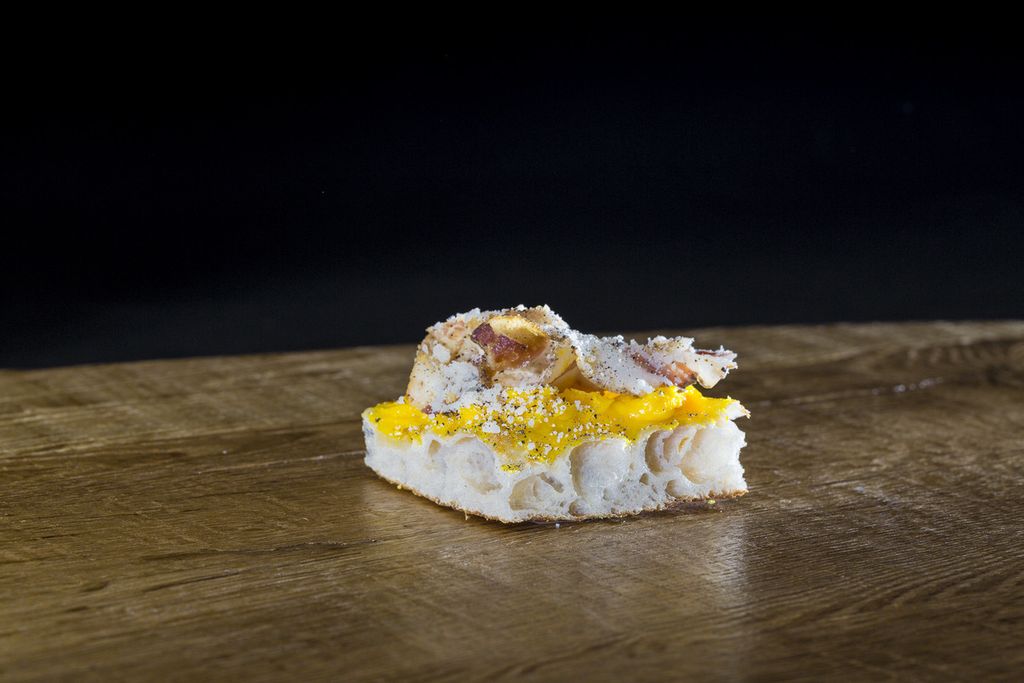 Da Tellia, la carbonara dello chef Enrico Murdocco da primo piatto diventa il gusto ricco e sostanzioso della pizza: un impasto cotto in teglia alla romana, idratato all’80%, a lunga maturazione, con farina di tipo 1 e 2, macinate a pietra. A questo si aggiunge un condimento a base di zabaione salato al pecorino realizzato mixando il tuorlo d'uovo con il pecorino romano e ritagli di guanciale, tutto cotto in sottovuoto. Per un tocco ancora più croccante, il guanciale viene affettato e cotto in forno alla massima temperatura per circa 3 minuti. Quanto all’impiattamento, si stende uno strato di zabaione al pecorino, si sistemano le fette di guanciale e si completa con del pecorino romano grattugiato e pepe nero.