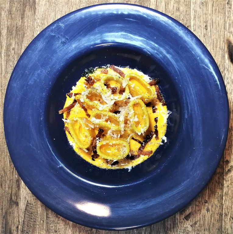 Una carbonara in versione vegetariana dove il guanciale e la sua componente aromatica vengono sostituite dall’utilizzo di diverse spezie, mentre il pecorino cede il posto al tuorlo disidratato e grattugiato. È una vera e propria “inversione di ruoli” l’anima ispiratrice di questa ricetta realizzata dal team di chef, tutto al femminile, di Al Tatto: composta da cremosi paccheri rigati insaporiti da un condimento a base di pepe, timo, ginepro, salvia, aglio e tuorlo disidratato.