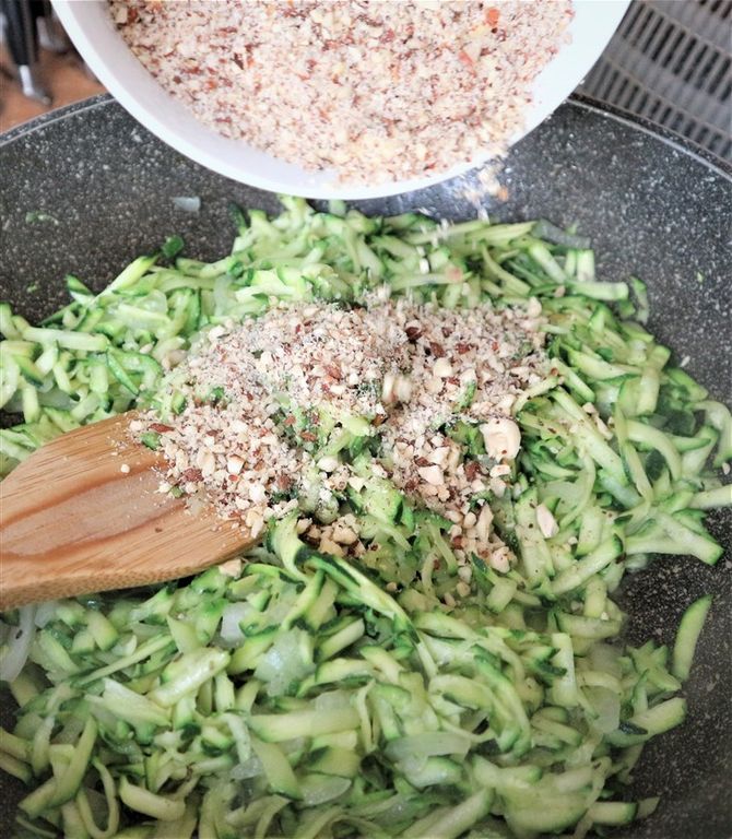 Preparazione: pulite e tritate la cipolla e fatela soffriggere con i due cucchiai d'olio d'oliva. Aggiungete le nocciole tritate e le zucchine tagliate finemente. Cuocete a fuoco lento per 10 minuti fino a quando il composto non risulti di consistenza morbida. Preriscaldate Il forno a 180°.