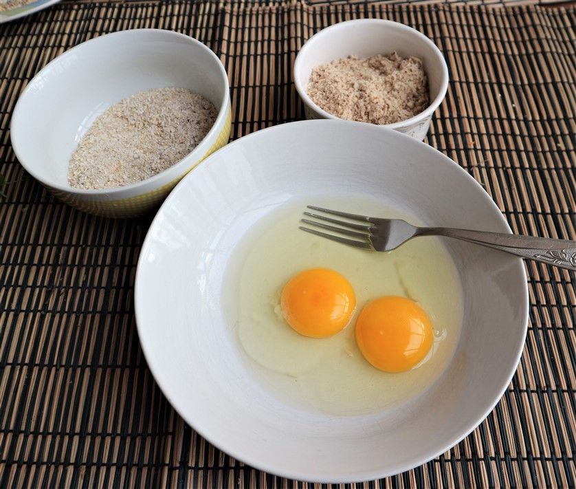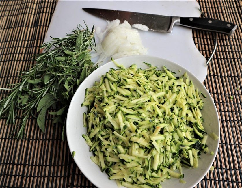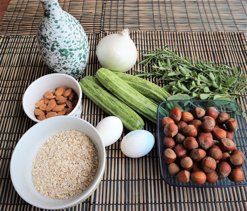100 g di nocciole tostate e tritate; 500 gr di zucchine; 75 gr di avena; 75 gr di mandorle; 2 uova; 30 g di formaggio grattugiato, 1 cipolla media; 2 cucchiai di olio d'oliva e erbe aromatiche a piacimento.
