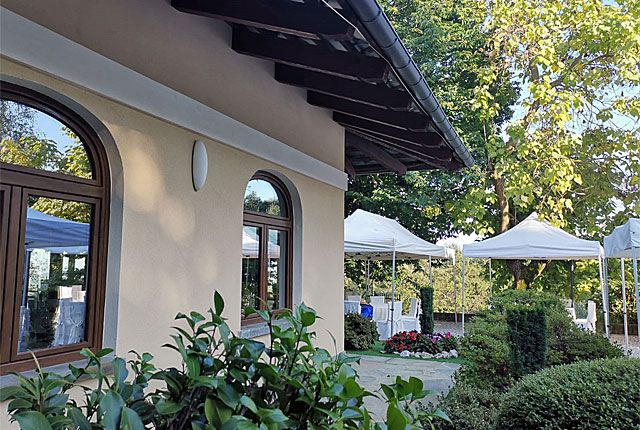 Una gradevole costruzione con ampi spazi, sia all’esterno, dove nella bella stagione si può pranzare all’aperto, e anche all’interno dove ci sono grandi sale, ben arredate e riccamente addobbate in occasioni di ricevimenti e matrimoni, che qui trovano una splendida location.