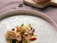 INVOLTINO DI SPADA, NOCI E TALEGGIO D.O.P. CON ERBE E SALE MEDITERRANEO INSALATA DI PERE MISTE, SEDANO E MENTA