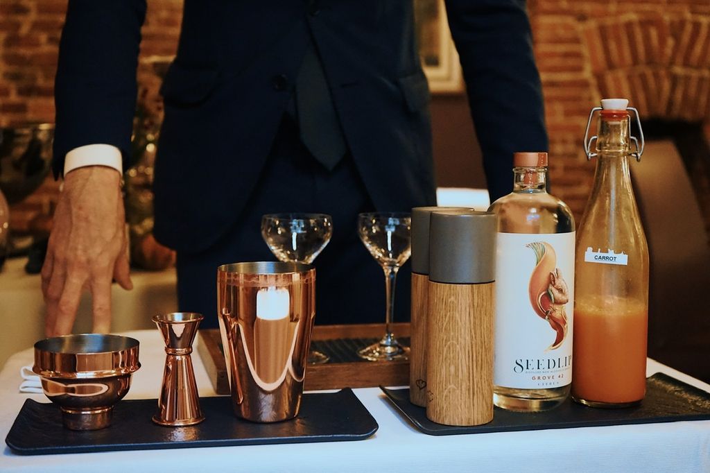 Molto interessante è anche per la proposta “ liquida”, elegante e diversa dal solito, da consumarsi, a scelta, durante la cena: ci sarà quindi spazio per il Kombucha di benvenuto, a base di tè verde, scorze di arance calabresi e timo limone; per il Cocktail dell’amore servito con la Rosa di rapa bianca; per un infuso servito con la piccola pasticceria, che si tingerà di rosso in omaggio alla serata particolare; per il liquore giapponese di prugne umeshu, proposto al momento del dessert “Passione” - composto da una ganache al cioccolato bianco e vaniglia con un inserto tropicale di mango, banana e succo di maracuja, -che ne esalta le noti dolci, acide e fresche del piatto.