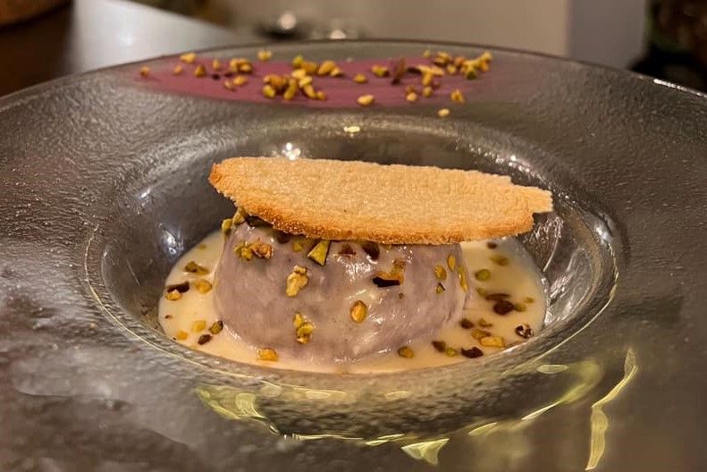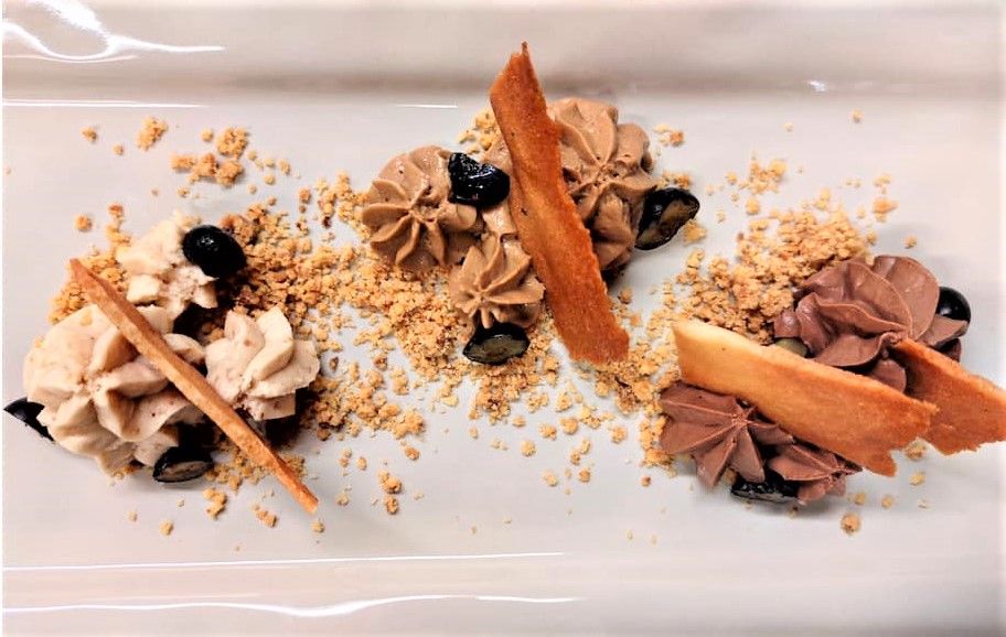 I dolci preparati con passione dalla chef sono tutti invitanti come la Nuance, tre mousse al torrone, alla nocciola e al cioccolato con crumble di nocciola e mirtilli freschi, oppure la crema tiramisù al pistacchio, crumble di savoiardo, crema al caffè.
