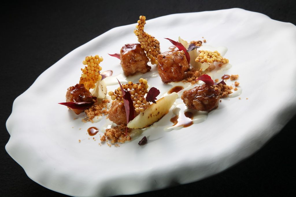 Partendo dagli antipasti (tutti a 20 Euro) citiamo la Seppia con il suo nero, mandorla, limone, mela, finocchio e liquirizia, oppure la Capasanta cruda, topinambur, nocciole, sedano, emulsione ai ricci di mare o ancora il Coniglio in terrina di cosce e spalle, lombo in porchetta, scalogno marinato, sesamo, peperone alla brace, ketchup di agrumi.