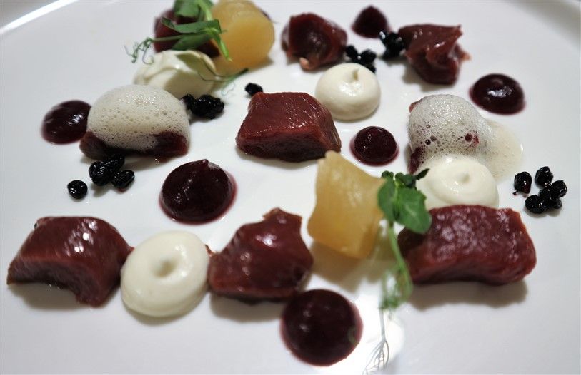 Fra i secondi, a 26 Euro, si può scegliere tra la Rana pescatrice al sugo alla cacciatora, ketchup di porcini, cozze e patate oppure il Maiale nero di Cavour con acciuga, capperi, limone sedano rapa.