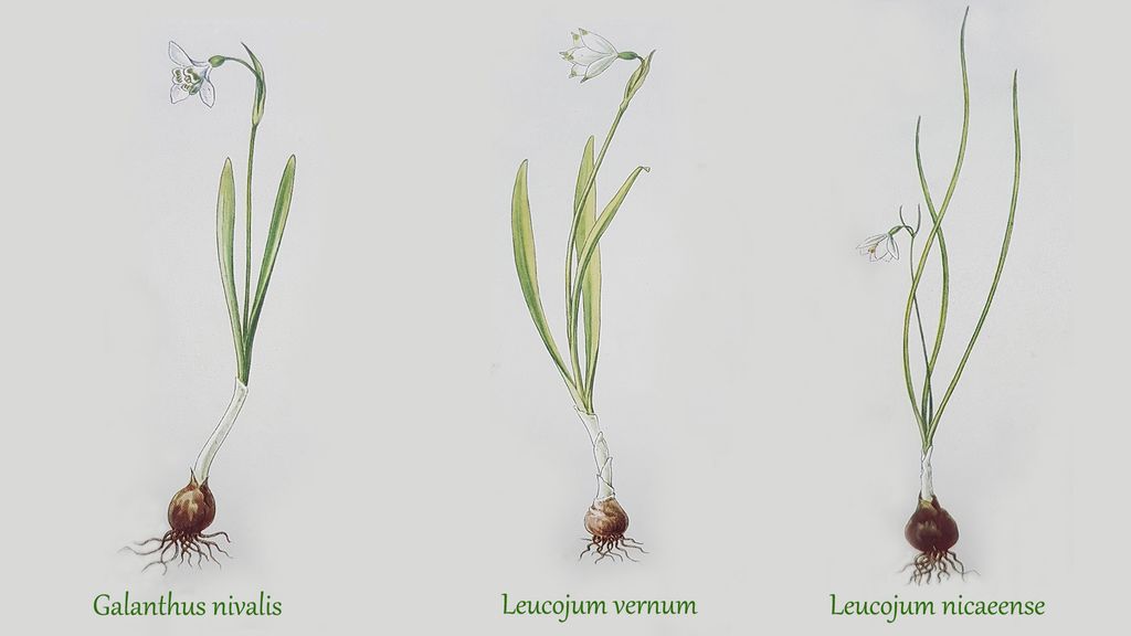 È quasi d’obbligo per il profano confondere l’una con l’altra specie. Entrambi hanno un’altezza media che va dai 15 ai 20 cm. La più evidente differenza morfologica consiste nella forma dei tepali. Un’attenta osservazione può rivelare che il fiore del Bucaneve è composto da 6 tepali. I 3 esterni, lunghi circa 2 cm, sono bianchi ed hanno una forma oblunga. I 3 tepali interni sono più corti, bi-lobati, bianchi e con striature di color verde. Anche il fiore del Campanellino possiede 6 tepali ma questi, a differenza del Bucaneve, hanno egual lunghezza e al loro apice vi è una macchiolina di color giallo/verde.
