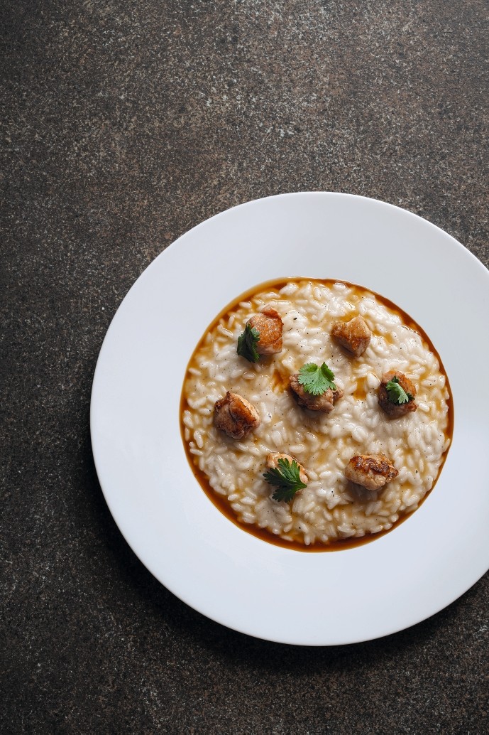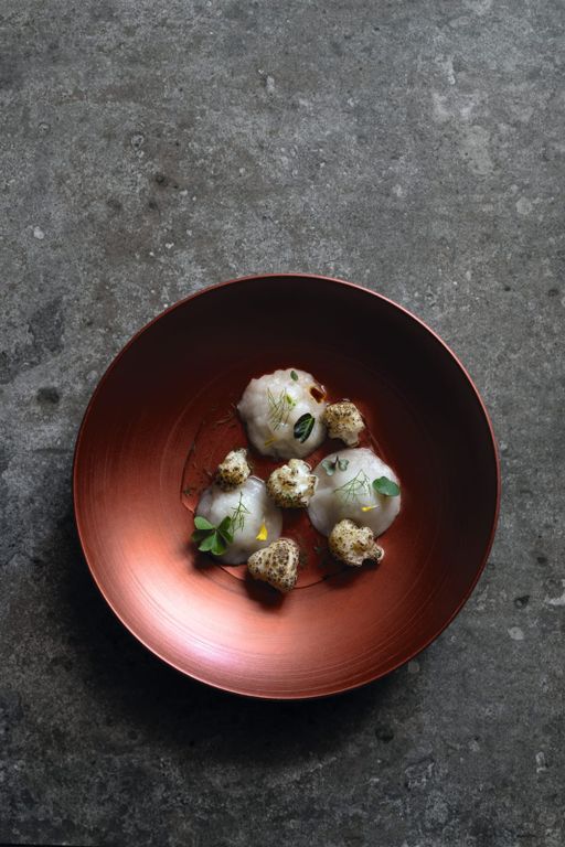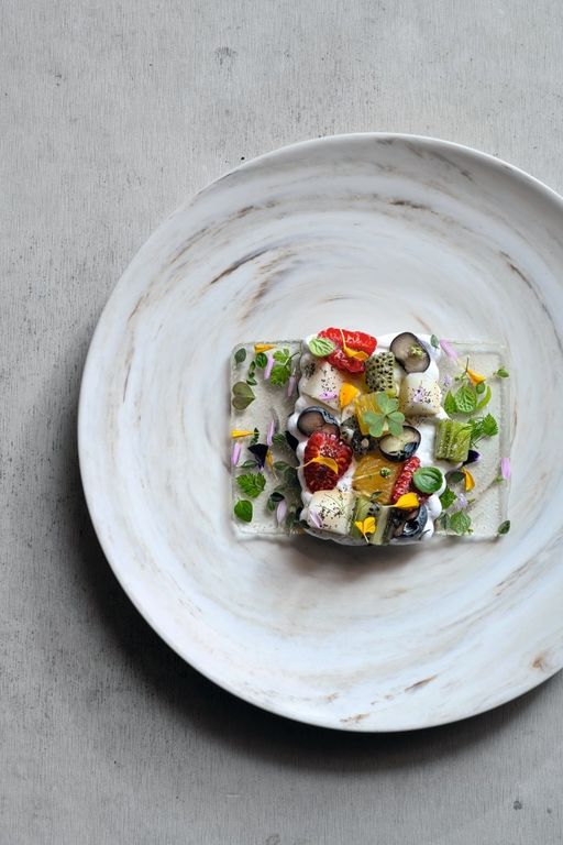 Per la sezione Terra, sicuramente il risotto cacio e pepe, animelle di vitello e coriandolo; per il mare, capesante, cavolfiore e infuso di finocchio; e, infine, per la sezione vegetale, ho scelto quello che mi rappresenta di più e che propongo sempre in carta , la mattonella di frutta composta da una frolla alla mandorla, una crema al formaggio dolce di capra ( di un’azienda agricola della zona) e aromatizzato alla vaniglia.