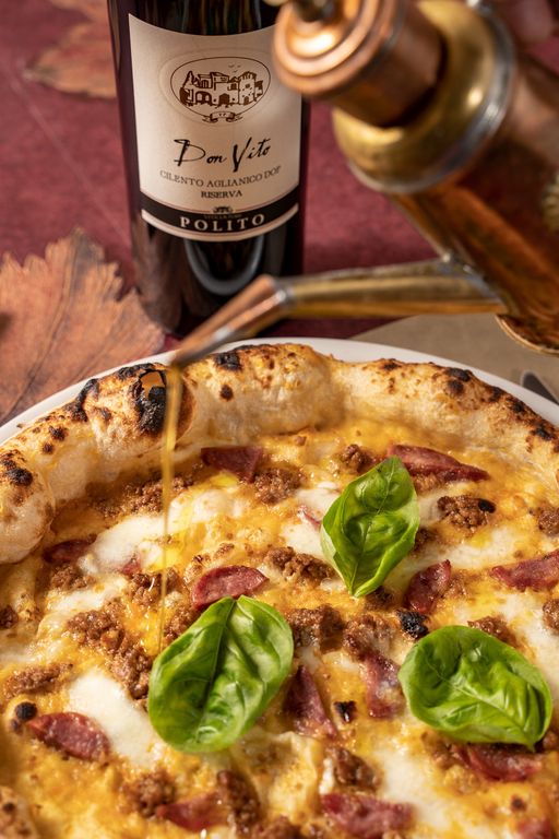 I condimenti sono realizzati con materie prime locali, come i Presidi Slow Food pomodoro Antico di Napoli, Olive Nere Caiazzane e Salame Stagionato di Castelpoto, con preparazioni autoprodotte – dalle confetture alle creme – e con ingredienti extraregionali. Il ragazzo sta crescendo e quando gli si chiede in che luogo immagina di trovarsi, la sua risposta è chiara e semplice: “in un laboratorio ancora più grande a impastare per più persone che, si spera, potranno apprezzare la mia idea di pizza, sviluppata e affinata nel mio piccolo paese”.
