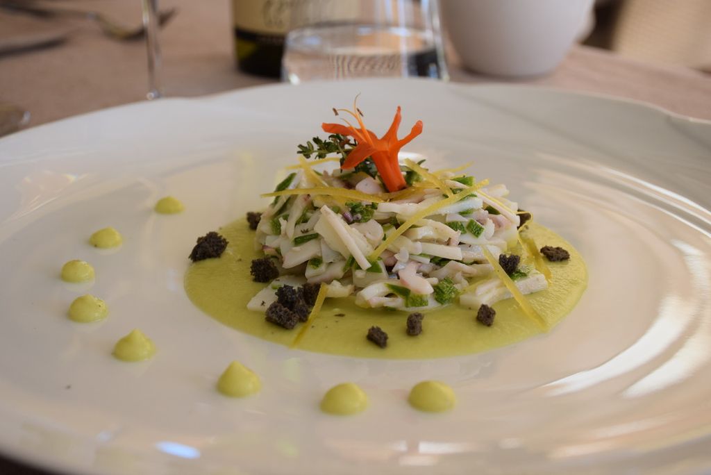 Il menù cambia ad ogni stagione, lo chef si serve dai contadini e dai pescatori locali. Dal menù citiamo tra gli antipasti lo scrigno di acciughe marinate alla Ligure con ripieno di confit di cipolla rossa e la nuvola di finocchi croccanti ( 15 euro). Si continua con le invitanti tagliatelle nere con sughetto di seppioline, vongole e broccoletti croccanti (17 euro) oppure i ravioli gialli allo zafferano ripieni di pescato con la salsa ai carciofi d’Albenga (18 euro).