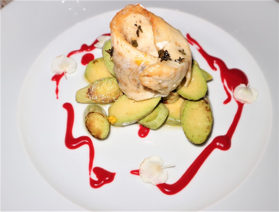 Turbante di Branzino aromatizzato alla maggiorana e pistilli di Begonia bianca su crema di Begonia rossa e trombette saltate