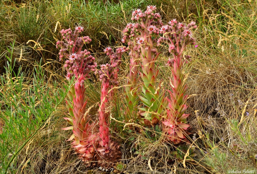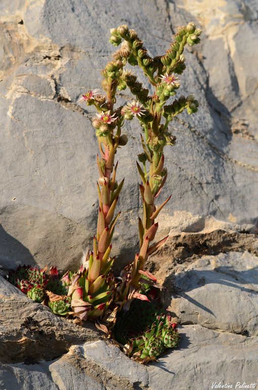 Il Sempervivum calcareum (Semprevivo del calcare) indigeno dell’estremo Ponente ligure, differisce dalle altre specie, per avere la sommità delle foglie basali macchiata di bruno.