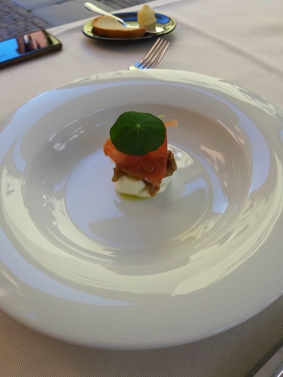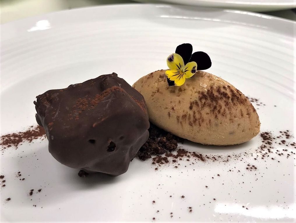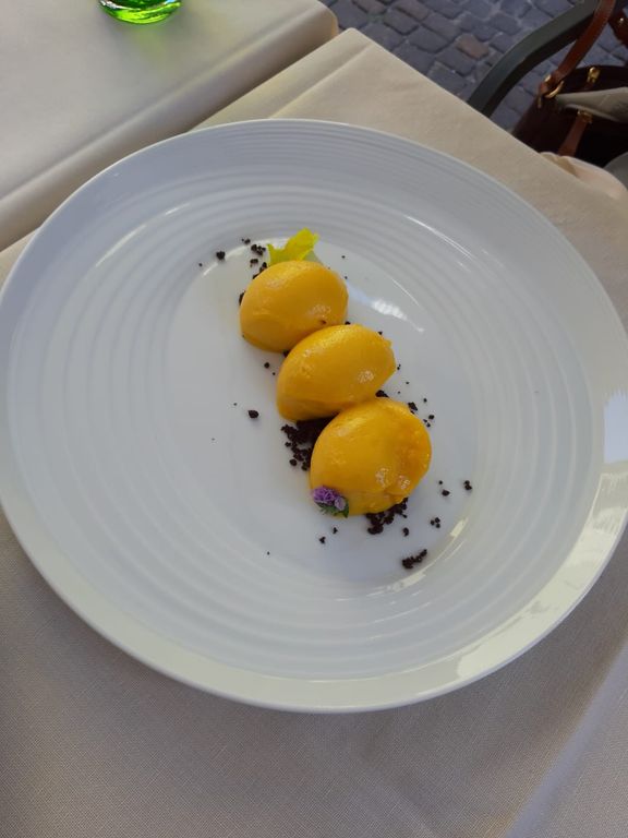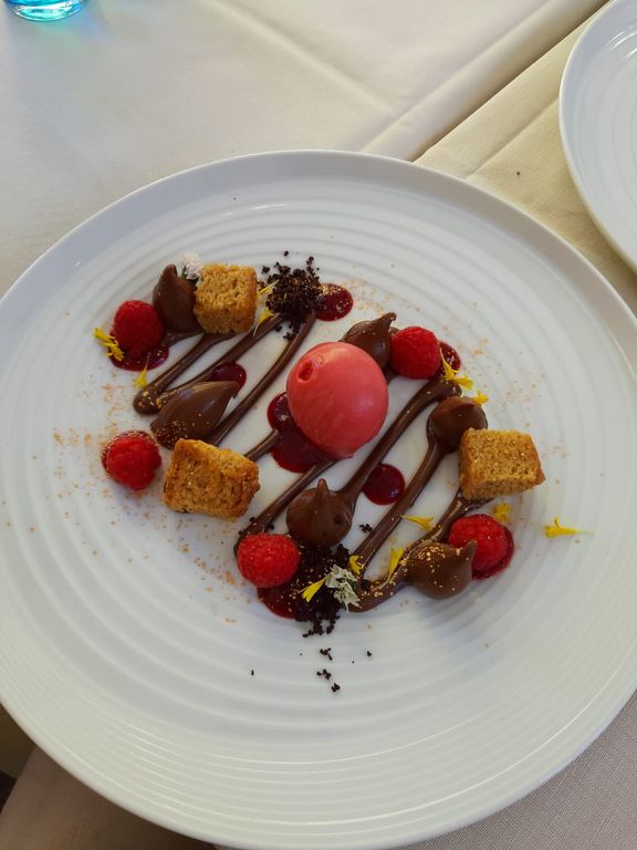 Alla carta troviamo specialità anche di pesce, come il polpo scottato, cremoso di patata, paprika affumicata e crema di peperoni oppure le chiocciole dell’Azienda agricola Paolo Bove fondo bruno, sedano rapa e tartufo nero. Dolci interessanti come il riso al latte, lamponi, cioccolato bianco e cocco e i sorbetti preparati dagli chef.