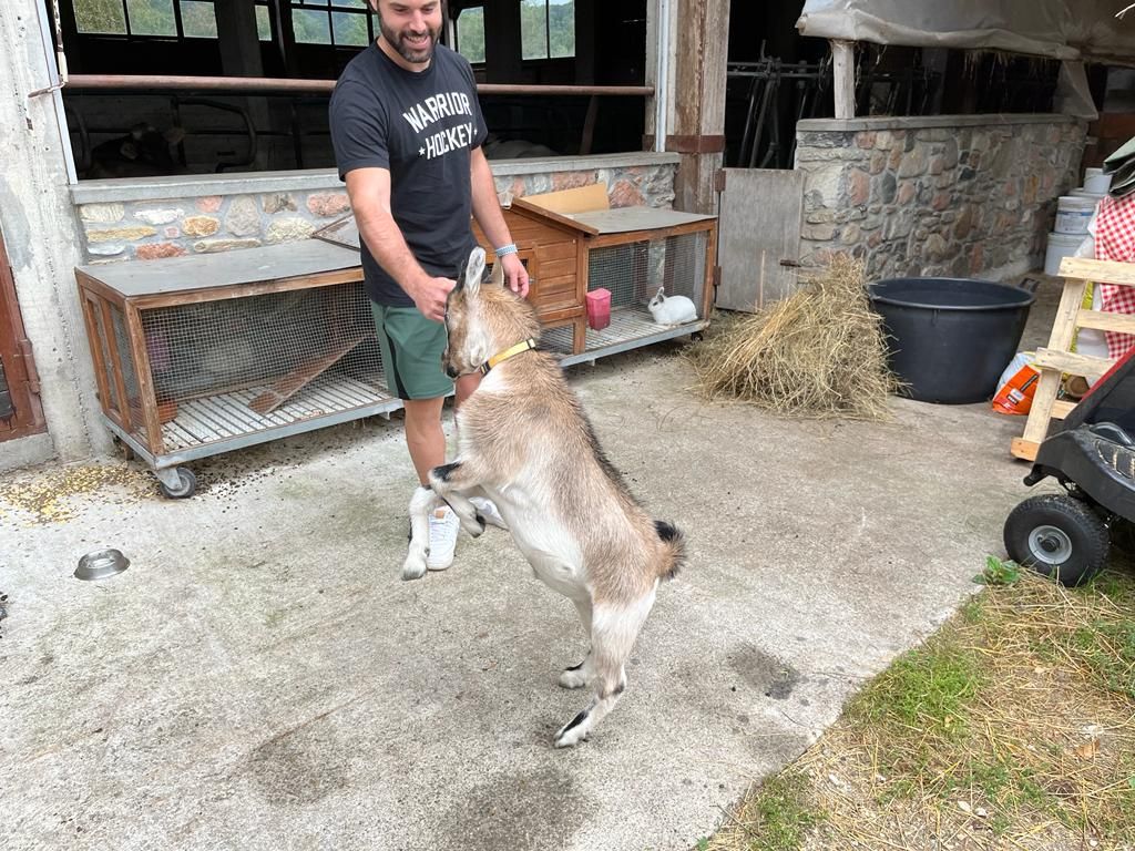 Lorenzo, emblema della determinazione sul ghiaccio, conserva queste doti anche tra i recinti dell'Azienda agricola e agriturismo Piccinelli di Brinzio. Senza però rinunciare alla dolcezza, come quando abbraccia il piccolo Valentino, un capretto nato lo scorso 14 febbraio: «È la mascotte di casa nostra - racconta - ed è un po' anche il padrone di casa».