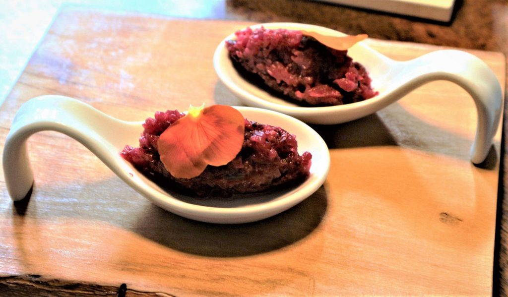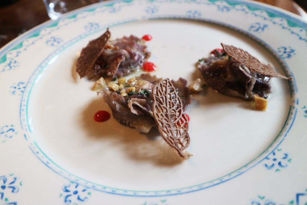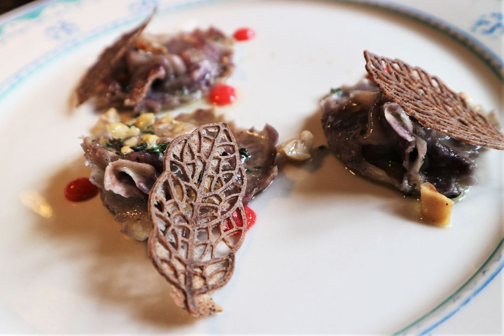 Il primo è costituisco da un piatto che tiene insieme i sapori del sottobosco in un abbinamento non scontato e di grande sapore: tortelli ai frutti di bosco ripieni di Toma brigasca con olio alle nocciole e timo.