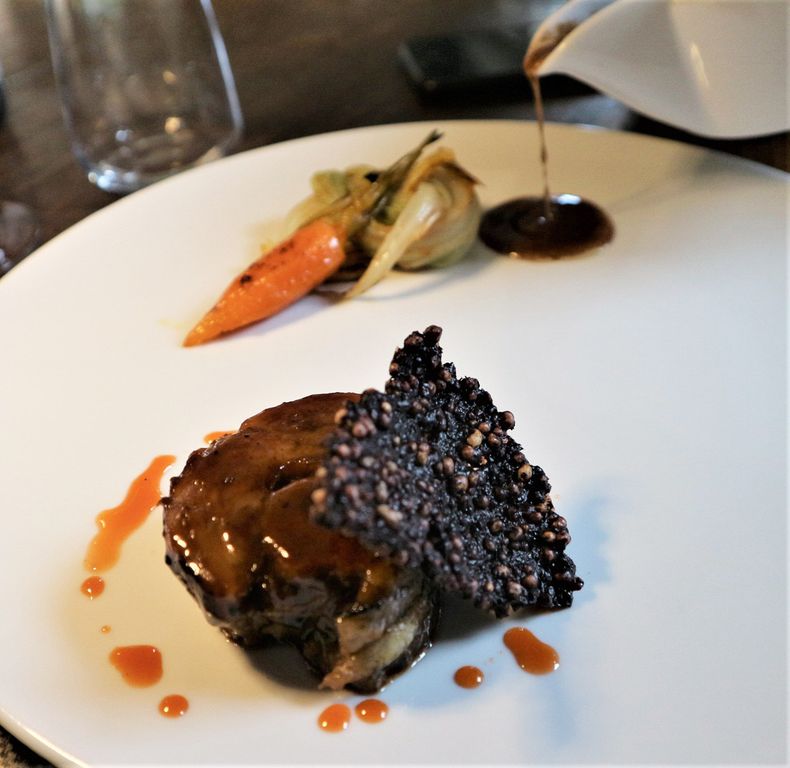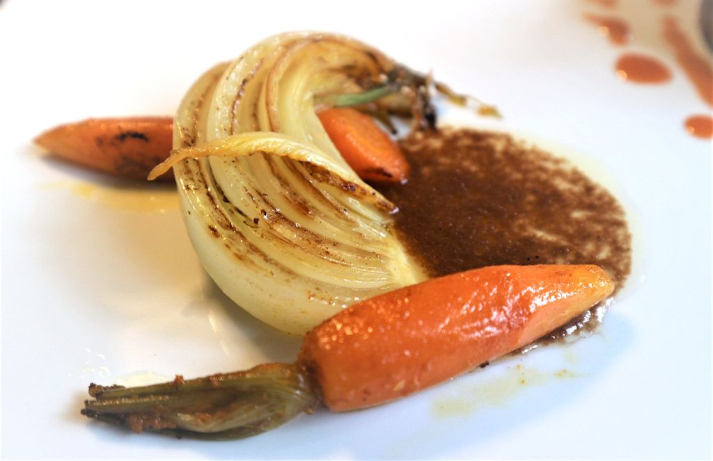 Il secondo è un delizioso maialino laccato al miele e arancia con il suo fondo e verdure di stagione, finocchio e carote.