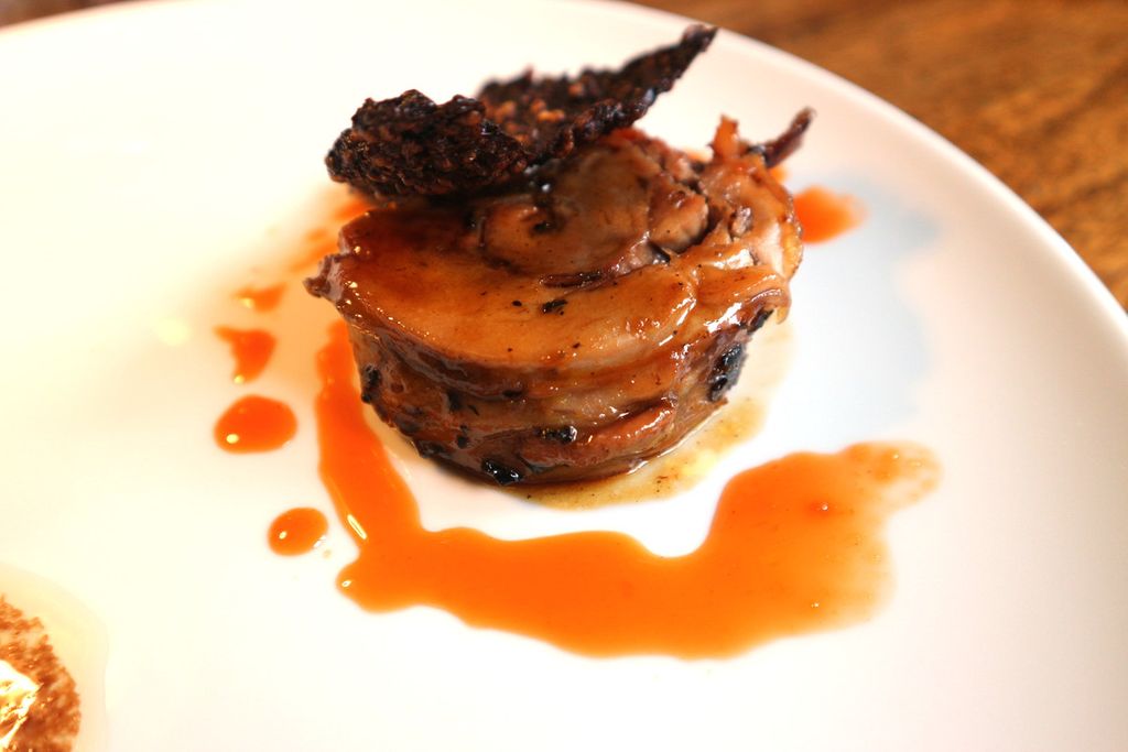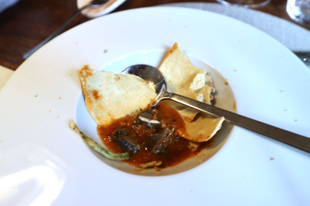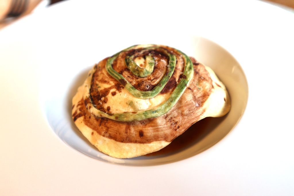 la gallina padovana rivisitata e per finire la sorpresa delle lumachine al pizzico con guscio di pasta matta, da rompere con la forchetta e gustare con il cucchiaio.