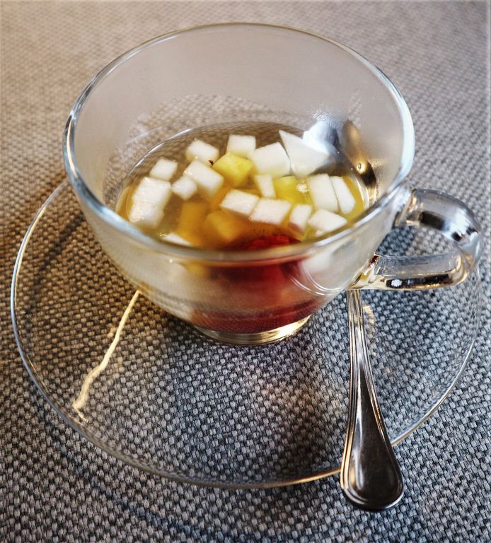 Un’insalatina di frutta e fiori con infuso di Rosa Canina e zenzero, servita come predessert