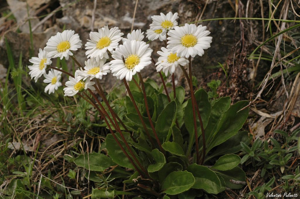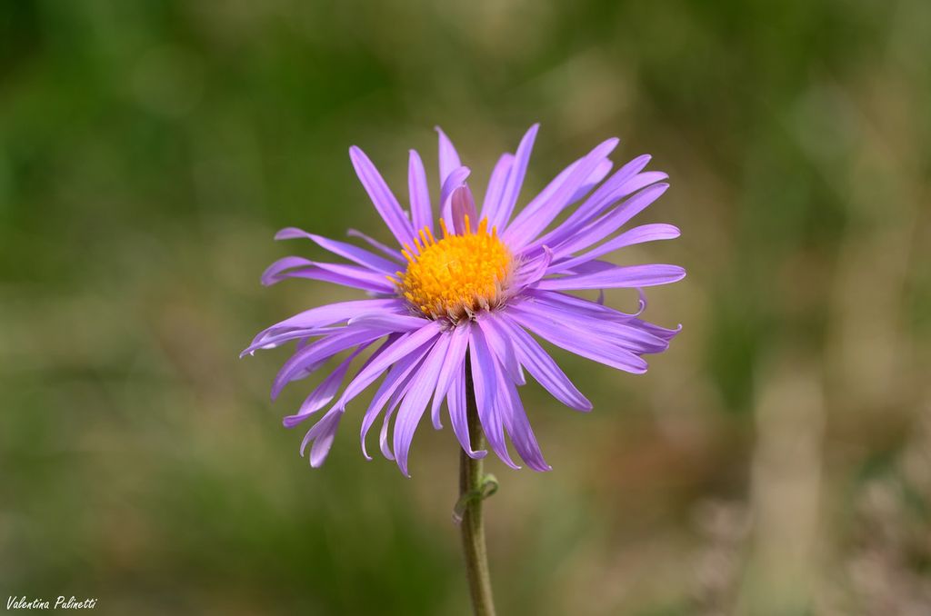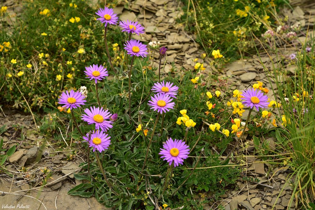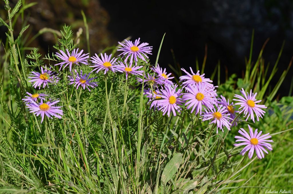 Le infiorescenze degli aster sono composte da un unico capolino, che ricorda per la sua forma quella della margherita. Un vero e proprio gioiello dei nostri monti è l’Aster alpinus che cresce nell’Italia centrosettentrionale a quote comprese fra 1000 e 2500 m s.l.m. Il termine specifico alpinus fa riferimento al suo habitat abituale costituito dai pascoli alpini e praterie aride. Predilige i terreni asciutti e ben drenati ed è in grado di formare vistosi tappeti fioriti che non passano inosservati ai frequentatori della montagna. L’infiorescenza presenta un diametro compreso fra 2,5 e 5 centimetri ed è morfologicamente costituita da due tipi di fiori: quelli interni, tubulari, di colore giallo, disposti a cerchio quasi a formare una sorta di “bottone” ed i petali esterni, dalla forma allungata e dal colore lilla-viola.