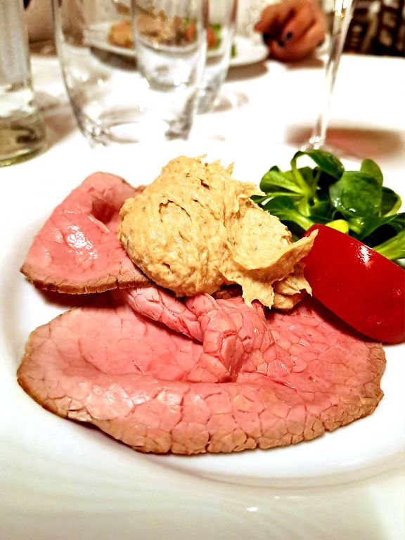 Tra gli antipasti citiamo la battuta di fassone con confettura di ananas, raschera di grotta, pinoli e maionese allo zenzero, (13 Euro), la tipica tartrà (budino salato) con porri, salvia e rosmarino, cruditè di carciofi e zabaione salato, (13 euro) e la tufeja, composta da involtini di cotenna di maiale con i fagioli borlotti (13 euro).