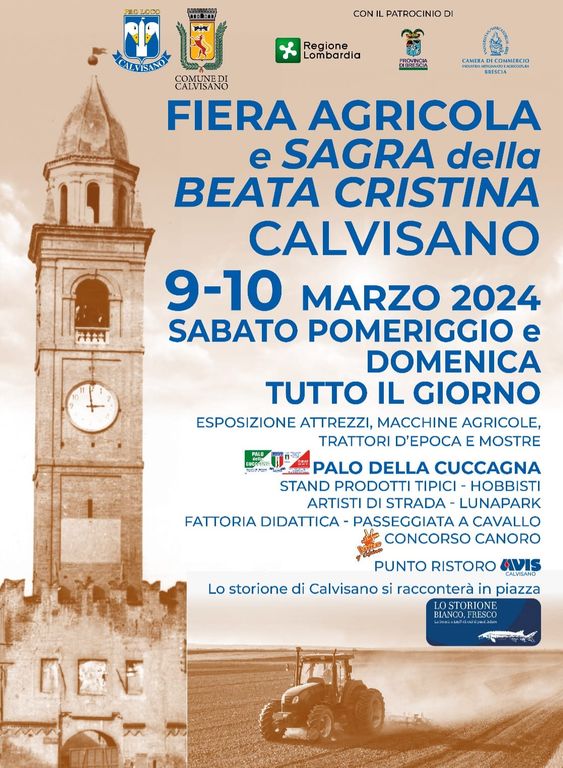 Convegni e momenti didattici non mancheranno. Grande protagonista sarà l’acqua che è la grande ricchezza della terra. Mostre, commedie, serate danzanti, corsi di cucina e tante altre iniziative renderanno speciale la Fiera Agricola. Immancabili i trattori, ovviamente in mostra insieme alle macchine agricole d'ogni tipo, che da sempre aiutano il lavoro dell'uomo. Ricco programma per partecipanti di ogni età. Bambini compresi, perchè la terra è un valore da insegnare anche ai più piccini. Si parla tanto di nativi digitali, a Calvisano si preferisce ricordare che la vera madre, di ogni cosa, è la terra, che grazie all'agricoltura viene custodita. Immancabile la parte gastronomica.