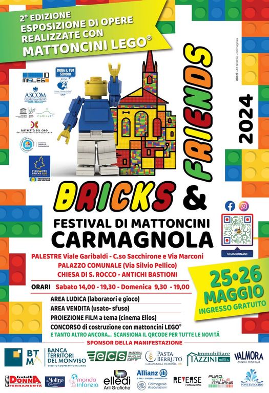 Carmagnola ospiterà per il secondo anno consecutivo una grande esposizione con oltre 80 espositori in circa 1.700 mq di opere create con i famosi mattoncini colorati in sei luoghi del centro città e nei musei, offrendo anche un'area ludica, laboratori, un film della serie “LEGO Star Wars”, uno spettacolo di circo teatro con l’uso di versioni extra-large dei mattoncini, una zona vendita e un concorso aperto a tutti.