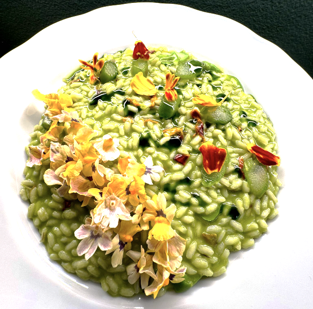 Con un estrattore ricavare il succo dai Nasturzi (10 gr) assieme a 200 gr di asparagi freschi. Tostare 100 gr di riso carnaroli L, sfumare con del vino bianco e portare a cottura bagnando con dell’acqua di tanto in tanto. Passati 14 minuti di cottura del riso togliere dal fuoco, lasciar riposare 2 minuti e mantecare con l’estratto di asparago e nasturzio, 10 gr di burro, 20 gr di asparagi crudi tagliati a lamelle. Impiantare, e guarnire con un’insalatina di Nemesia leggermente condita con olio, sale e aceto di lampone.