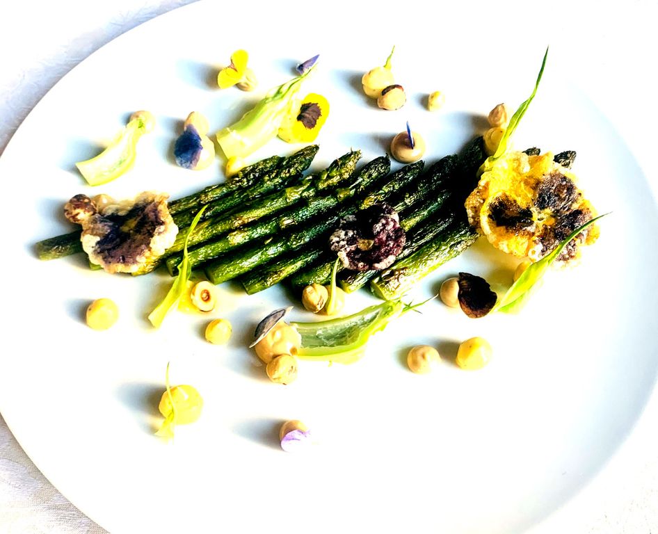 Asparagi di Santena con bernese alle nocciole e fiori in pastella