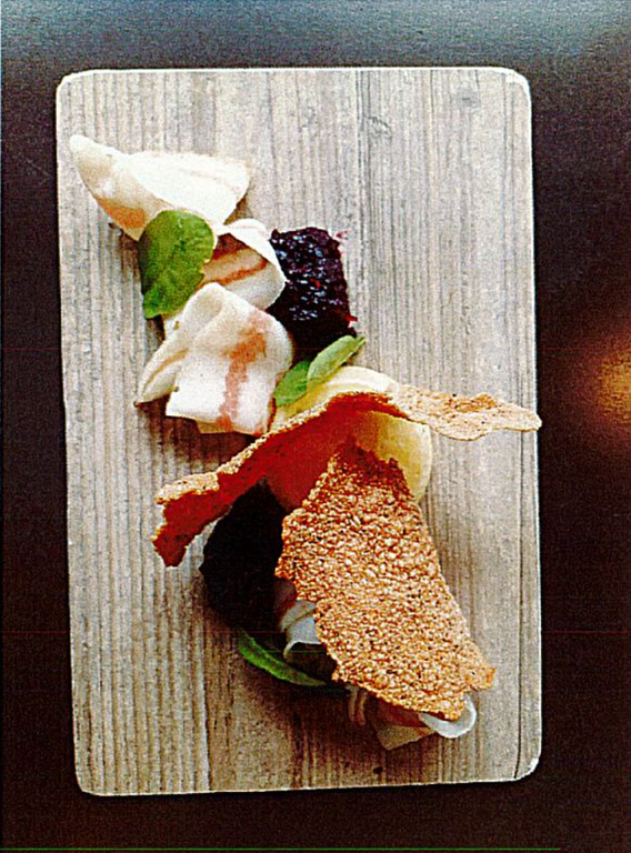 Piatto: Sformatino al Silter DOP, guanciale stagionato Norcineria Camuna, confettura ai frutti rossi e chips di mais nero spinoso