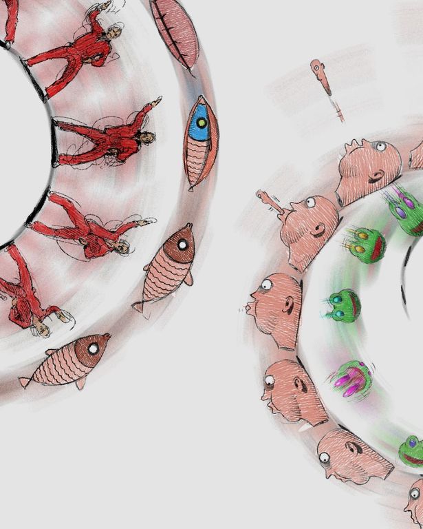 Con un sapiente lavoro manuale Sansone ha creato 26 diverse animazioni composte da 12 frame l’una, di figure bizzarre e colorate: mani che diventano fiori, uomini che si trasformano in palle rimbalzanti, rane pazze e teste che si gonfiano. Il pubblico, interagendo con le ruote - composte da due dischi, uno specchio e fori dai quali guardare - potrà vedere la proiezione di queste fotografie artistiche stroboscopiche, vivendo l’illusione del movimento in un’esperienza unica e coinvolgente e un vero e proprio gioco da fare insieme. La mostra sarà completata dal racconto del processo attraverso i divertenti bozzetti e schizzi di Sansone.