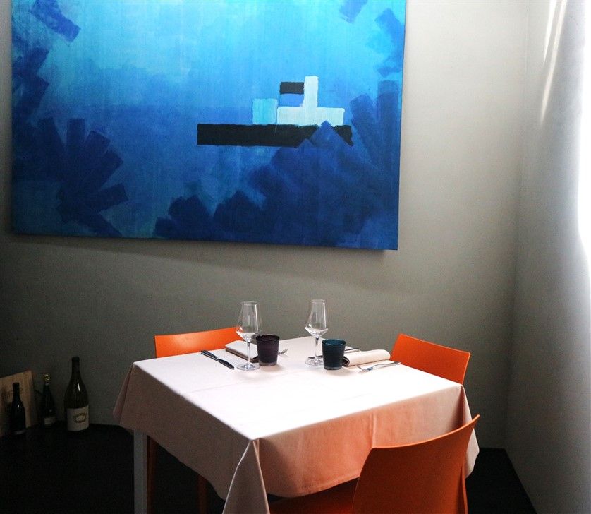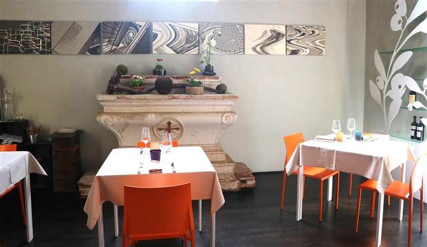 Al piano superiore, un'altra saletta accogliente con dodici posti offre una vista panoramica. Le pareti bianche e le sedie arancioni creano un contrasto raffinato e piacevole, arricchito da decorazioni floreali e bottiglie che abbelliscono i tavoli elegantemente apparecchiati.