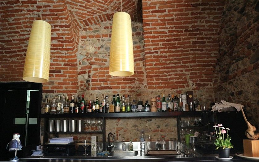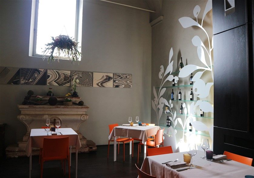 All'entrata, un bancone contemporaneo e le suggestive volte in mattoni ci conducono in spazi eleganti. Al primo piano, ci sono due sale: nella più grande spicca un altare a muro adornato con piante e oggetti che richiamano la stagione, mentre accanto si trova una saletta intima e riservata.