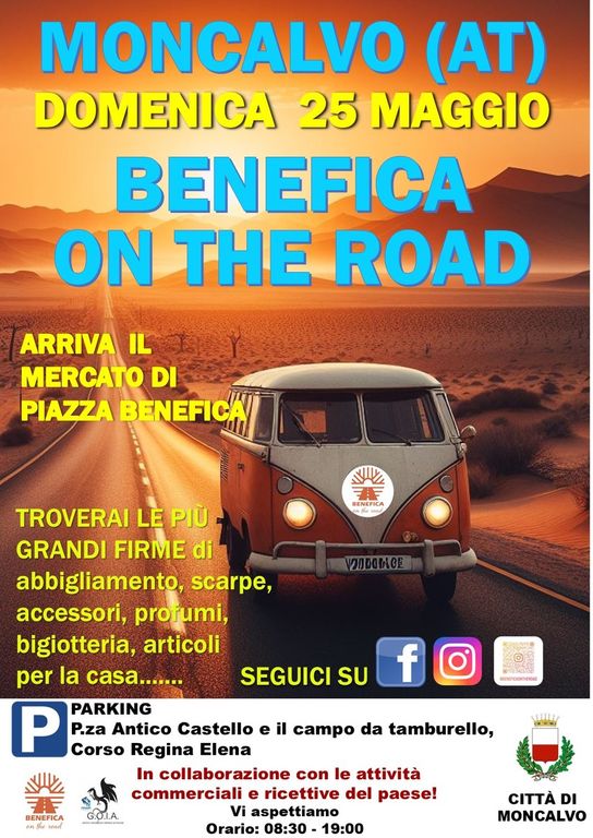 Dopo i successi nelle piazze delle città piemontesi PIAZZA BENEFICA ON THE ROAD arriva a Moncalvo con il patrocinio della Città di Moncalvo, con nuove proposte, dalle 8,30 alle 19, dove gli storici stocchisti e ambulanti di Piazza Benefica porteranno le migliori marche e firme di abbigliamento, calzature, accessori, profumi, bigiotteria e articoli per la casa Made in Italy con oltre 50 espositori per accontentare tutti i gusti e le esigenze di stile e di moda dei visitatori.