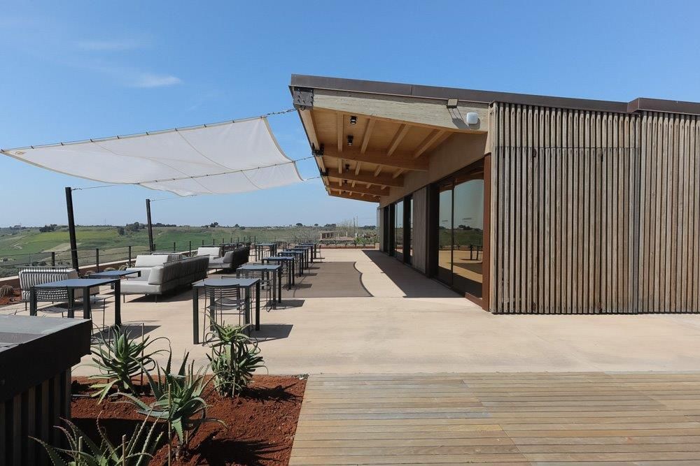 L’architettura della cantina, in parte interrata, è stata pensata per dialogare con l’ambiente, sfruttando la luce naturale e integrandosi con il paesaggio circostante. Dalla terrazza si apre una vista sul mare, da oltre vent’anni insignito della Bandiera Blu: uno scenario ideale per dar vita a qualcosa che vada oltre il vino, capace di raccontare la Sicilia autentica con una voce nuova.
