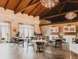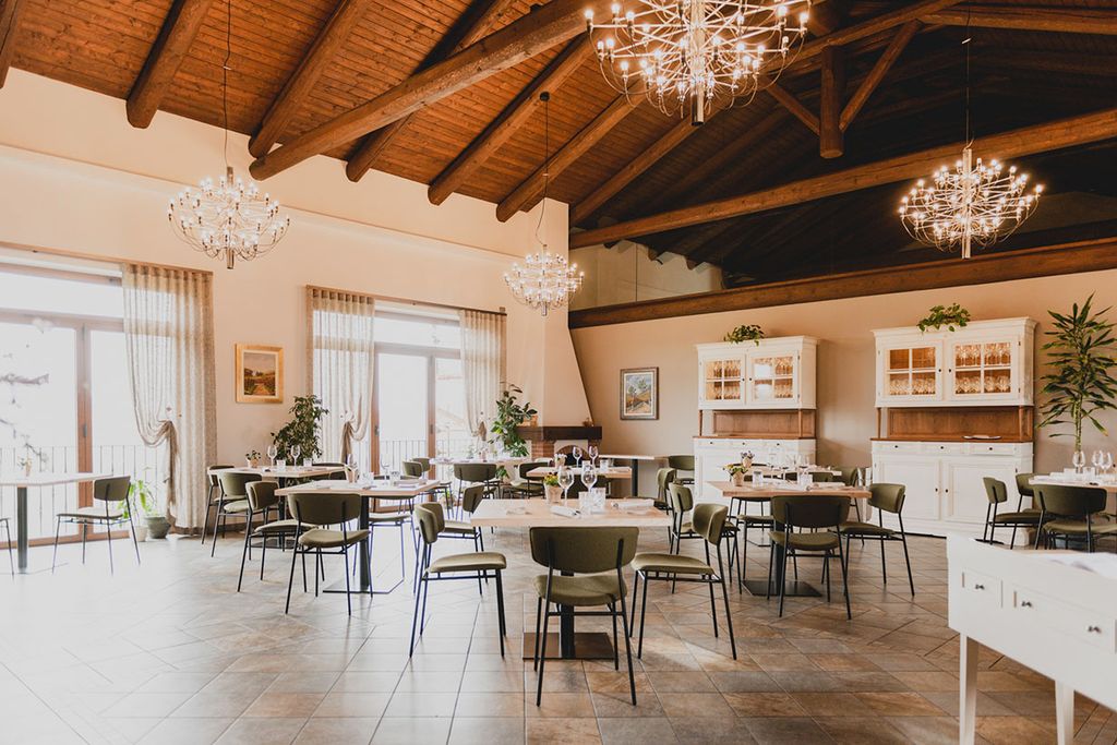 Una grande sala luminosa, con travi a vista e arredi eleganti, accoglie gli ospiti in un ambiente che sa essere al tempo stesso intimo e scenografico, ideale per vivere un’esperienza culinaria fatta di autenticità e ricerca.