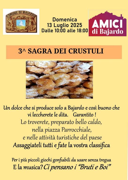 Bajardo festeggia la 3ª edizione della sua amata Sagra dei Crustuli, l’antico dolce tipico della tradizione locale, quest'anno stabilita per domenica 13 luglio 2025, a partire dalle 10:00 fino a sera.