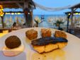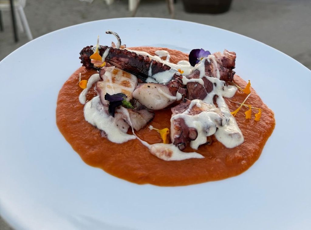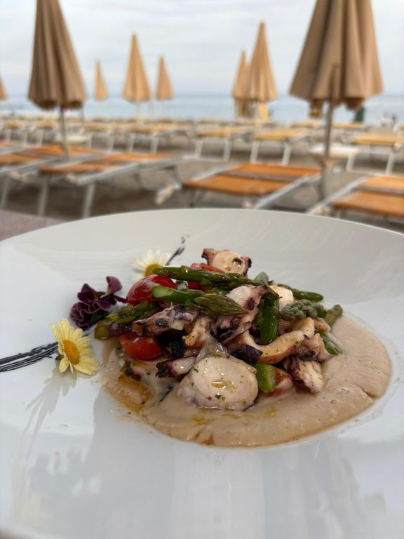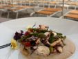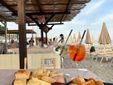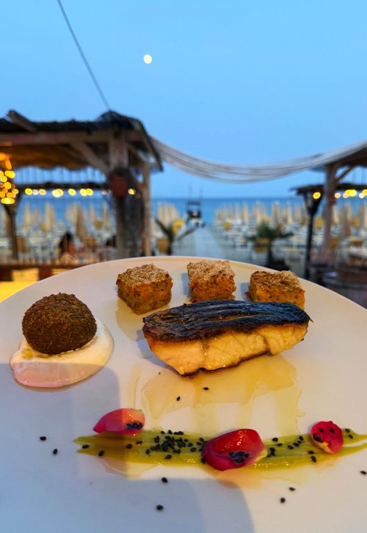La cucina, che non dimentica la tradizione, pur sperimentando inediti, gradevoli accostamenti, come nel Polpo arrosto, coulis di pomodoro, bufala liquida e olive disidratate, propone per dessert dolci deliziosi. Da provare la Torta della nonna con crema e pinoli e la Mousse alla nocciola e bisquit al cioccolato. Una ricca carta dei vini accompagna una cena quasi pieds dans l’eau, in attesa di lasciarsi trasportare dalla musica, dalla voce dell’artista marchigiano e dall’incantevole atmosfera in riva al mare, durante l’imperdibile concerto Doppia coppia di Neri Marcorè.