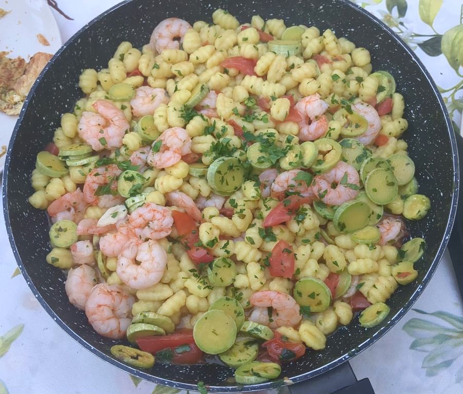 Taglia la zucchina a rondelle sottili e falle stufare in padella con un filo d’olio. Unisci i gamberi e cuocili per pochi minuti, finché diventano rosati. Cuoci gli gnocchetti in acqua salata, scolandoli direttamente nella padella. Manteca con un po’ di panna vegetale o con qualche cucchiaio di brodo per ottenere una consistenza cremosa. Regola di sale e pepe.
