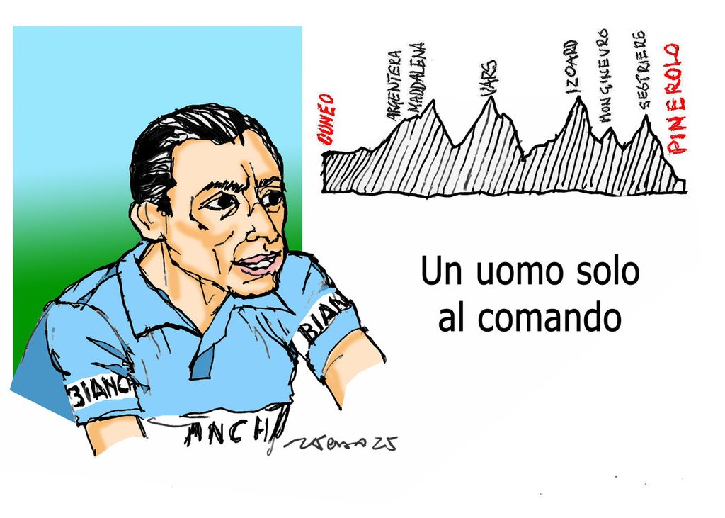 "Un uomo solo è al comando, la sua maglia è bianco-celeste, il suo nome è Fausto Coppi."