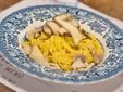 Si può iniziare con un antipasto misto ricco di sfumature territoriali (15,50 euro): vitello tonnato, insalata russa, tartare di manzo al tartufo nero, torta salata di riso e verdure, e formaggetta locale. Oppure optare per l’elegante uovo a bassa temperatura con spuma di parmigiano, purè di patate e tartufo nero (12 euro).