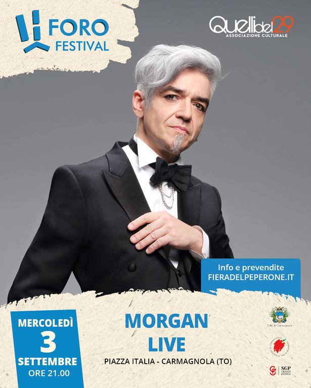 Mercoledì 3 settembre sarà la volta di Morgan, artista iconico e fuori dagli schemi, che salirà sul palco del Foro Festival per una serata unica e sorprendente. Con la sua voce inconfondibile e il suo stile che mescola rock e sperimentazione, regalerà al pubblico una serata intensa e piena di emozioni. Un’occasione imperdibile per tutti gli amanti della musica dal vivo