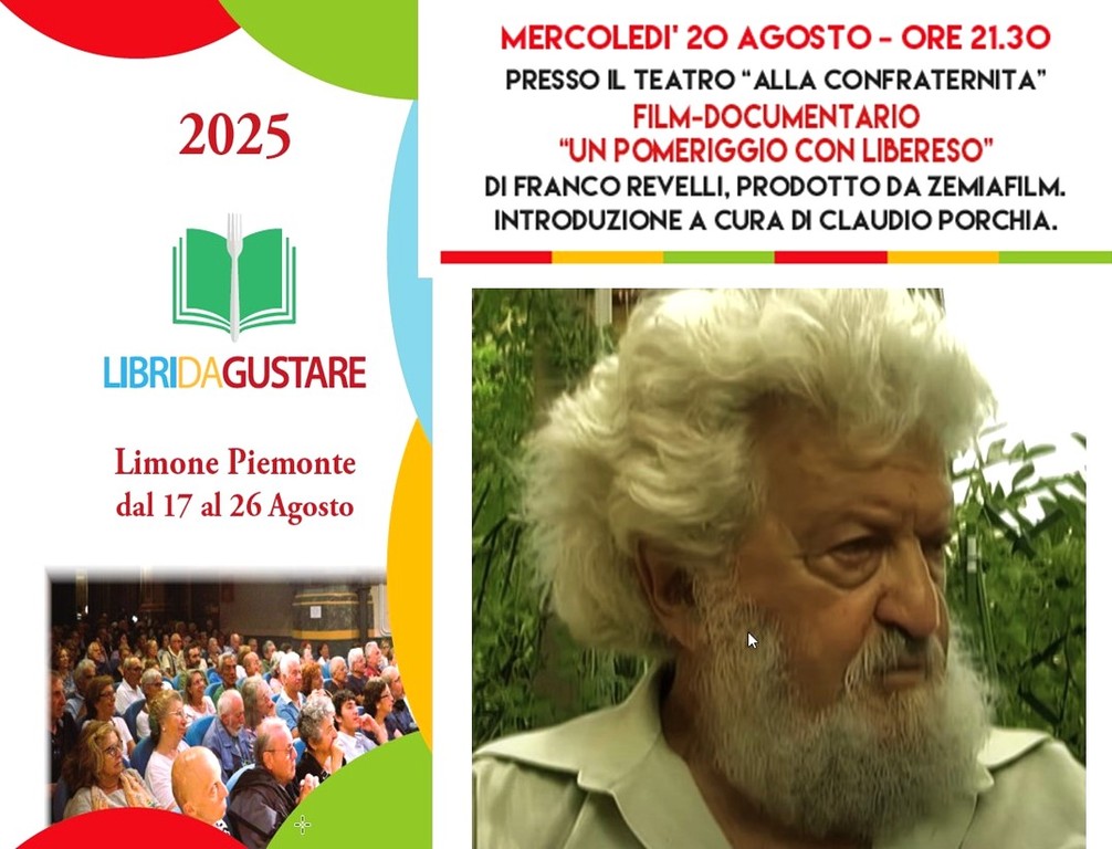 La rassegna, organizzata dall’Associazione Culturale Ristoranti della Tavolozza e diretta da Claudio Porchia, con il patrocinio del Comune e il sostegno del Grand Hotel Principe, proseguirà mercoledì 20 agosto alle 21.30 presso il Teatro Alla Confraternita con la proiezione del film Un pomeriggio con Libereso di Franco Revelli, introdotto da Claudio Porchia.