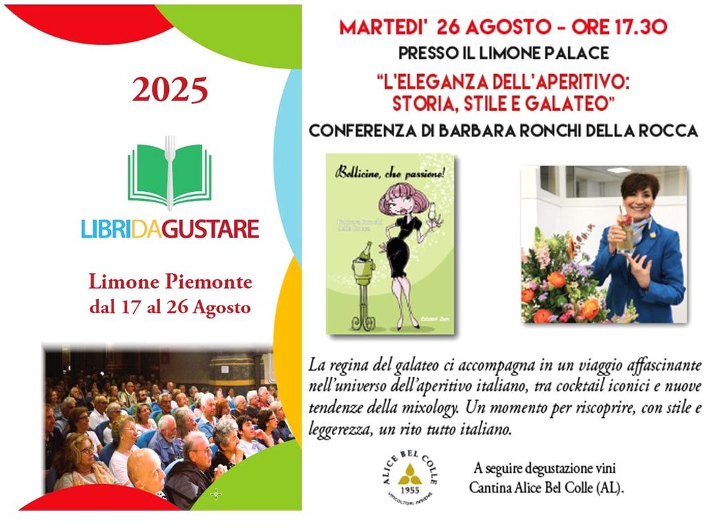 Durante l'incontro, Barbara Ronchi della Rocca guiderà il pubblico in un viaggio affascinante alla scoperta della storia e dei segreti dell'aperitivo. Dai grandi classici intramontabili come il Negroni e l’Americano, fino alle tendenze più innovative della mixology contemporanea, verranno esplorati non solo cocktail e abbinamenti, ma soprattutto le buone maniere e quei piccoli gesti che trasformano un semplice drink in un momento di autentica convivialità. Sarà un'occasione unica per riscoprire il piacere di stare insieme con grazia e leggerezza, imparando a essere ospiti e padroni di casa impeccabili. A rendere ancora più piacevole la serata, un aperitivo-degustazione offerto dal Residence Palace e accompagnato dai vini della Cantina di Alice Bel Colle, che anche quest’anno ha presentato etichette di grande pregio, tra cui Barbera, Chardonnay e Moscato dolce.