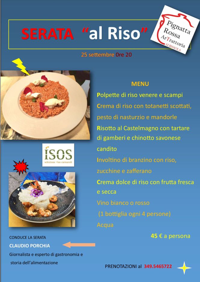 La serata si apre con sfiziose polpette di riso venere e scampi, seguite da una delicata crema di riso con totanetti scottati, arricchita da pesto di nasturzio e mandorle. Si prosegue con un raffinato risotto al Castelmagno, impreziosito da tartare di gamberi e chinotto savonese candito, e con un elegante involtino di branzino con riso, zucchine e zafferano. A chiudere, una morbida e avvolgente crema dolce di riso con frutta fresca e secca, per un finale che unisce leggerezza e gusto. Prezzo del menù 45 euro a persona incluse bevande, acqua, vino (1 bottiglia ogni 4 persone).